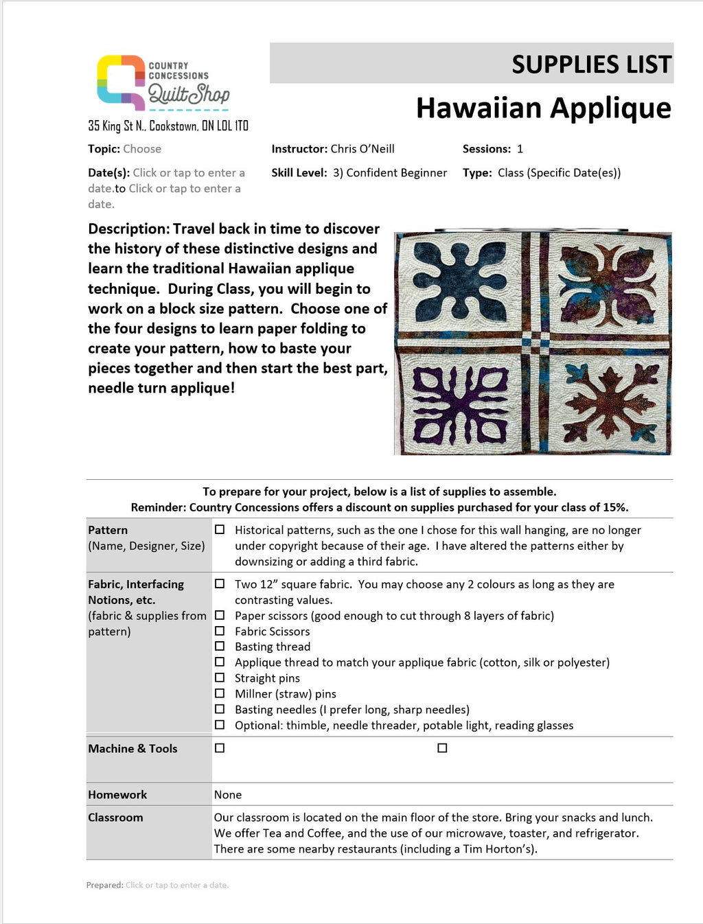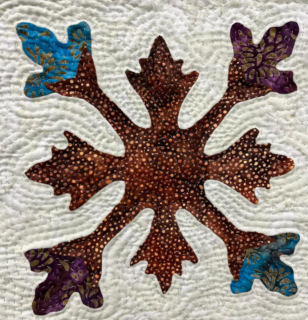 DESCRIPTION: Travel back in time to discover the history of these distinctive designs and learn the traditional Hawaiian applique technique. During Class, you will begin to work on a block size pattern. Choose one of the four designs to learn paper folding to create your pattern, how to baste your pieces together and then start the best part, needle turn applique!