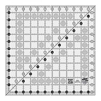 This 12-1/2 inch square features easy-to-read black and white markings printed in 1 inch grids marked in 1/8 and 1/4 inch increments. Use the easy-to-read, black numbers (printed on white dots) and the 1/4 inch grip sides to cut whole inches. The 1/4 inch dashed lines printed on two adjoining sides aid in trimming seam allowances. Use the patented Turn-A-Round feature — designated by the easy to read, numerical white numbers (printed on black dots) and the 1/2 inch grip sides — to add the 1/2 inch seam allowance. A 45 degree angle is printed in black and is used to trim half-square triangles to size. White horizontal and vertical lines are printed on the square so the center of the ruler is easily distinguishable. Use these lines to square up blocks based on four-patches or embroidered and appliqued blocks. The ruler slides easily over the fabric until pressure is applied. Then, our exclusive gripper holds the fabric in place while cutting, eliminating slipping and miss-cuts! Scan the QR Code printed on the ruler to view a video demonstration of these features. Total Size - 12-1/2in x 12-1/2in