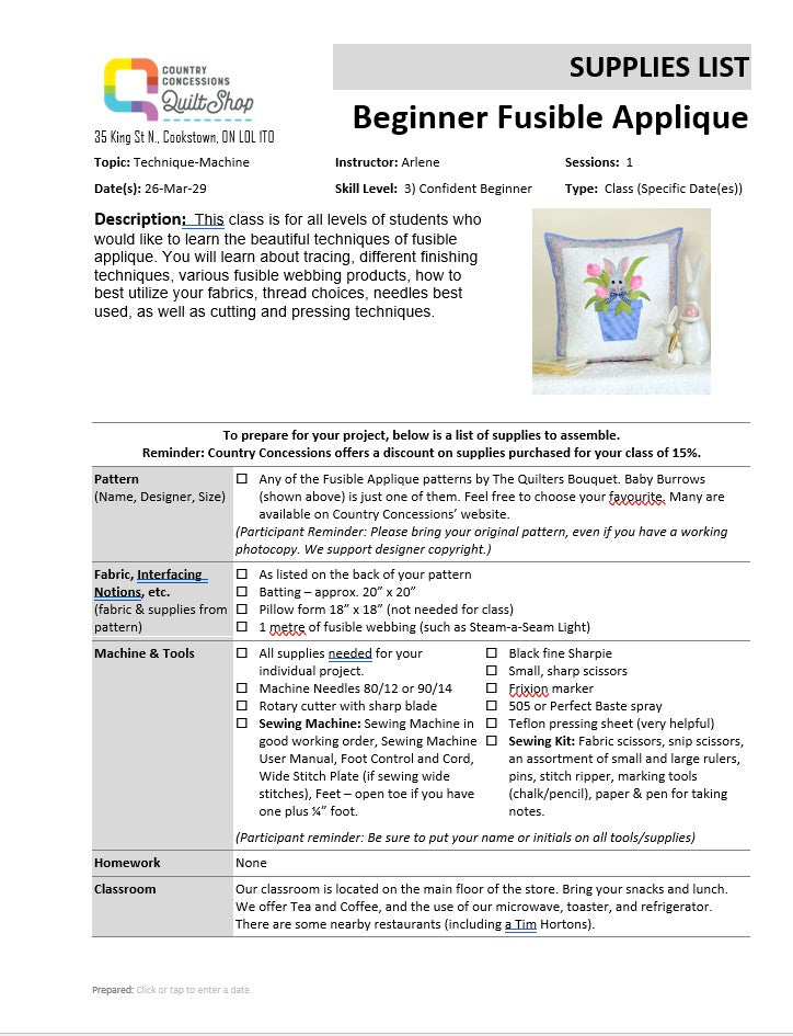 You will learn about the different fusible web products. When one is better to be used over another. How to correctly trace your images and fuse to your fabric. Proper cutting and final fusing to your background, as well as the various stitches that can be used to finish your edges. Once you pick your pattern please follow the fabric requirements for your specific pattern design. If time permits, we can talk about quilting your project and possibly start the quilting process. Class runs 10am - 4pm